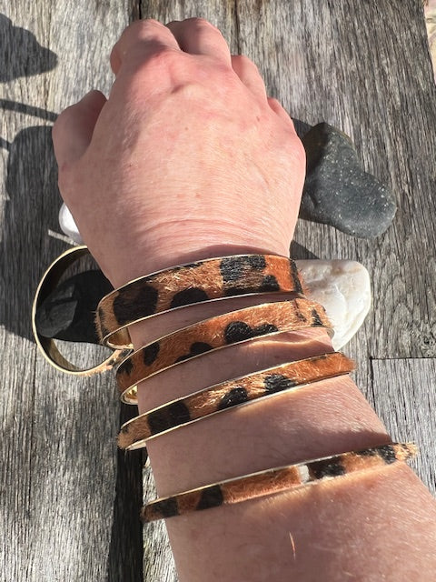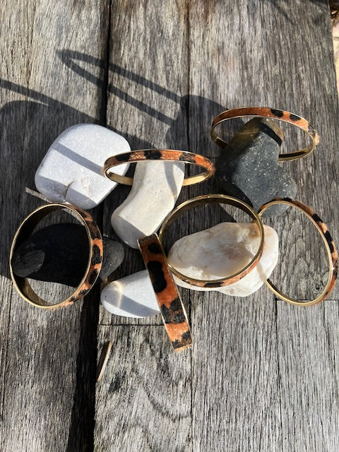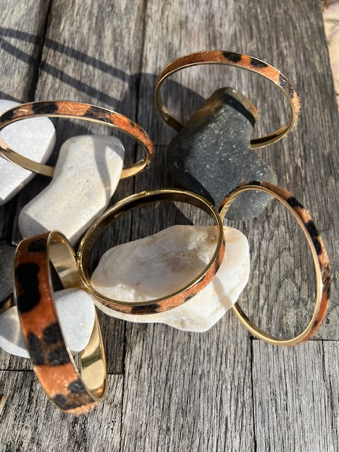 Jonc en acier inoxydable doré avec des motifs léopard irréguliers, à porter combiné avec d'autre bracelets ou bien à cumuler en différentes largeurs.