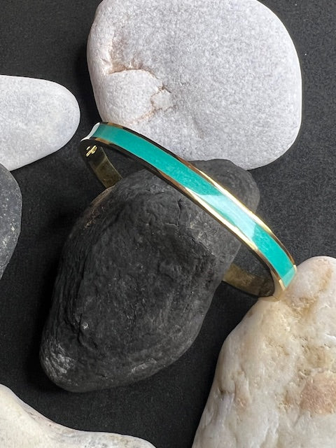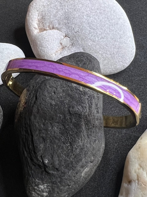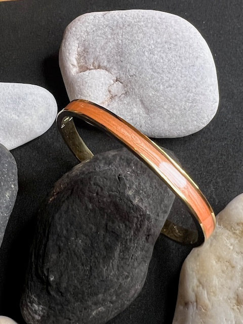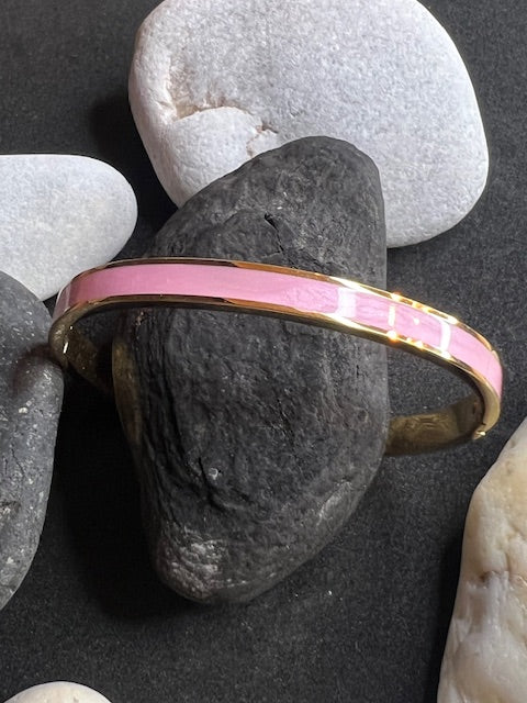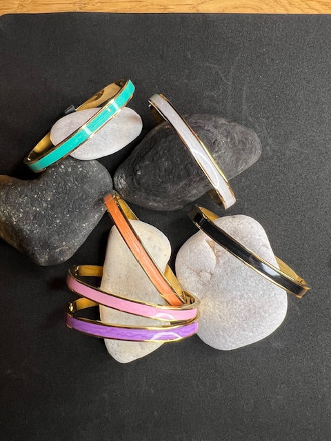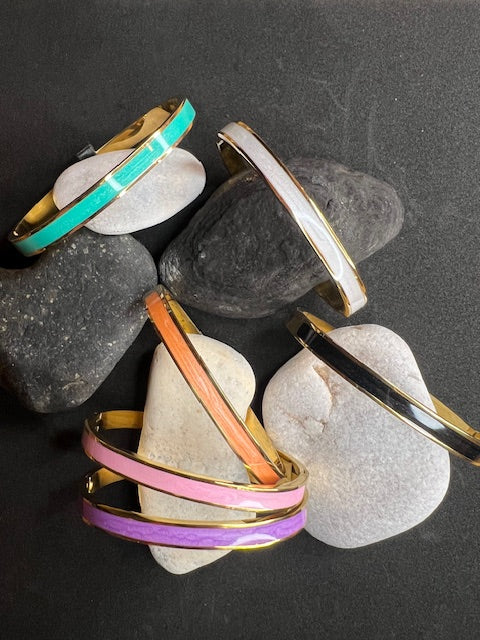 Jolis joncs ajustables avec bandes en émail coloré en acier inoxydable doré, plusieurs coloris au choix: noir, blanc, lilas, mandarine, turquoise ou rose.