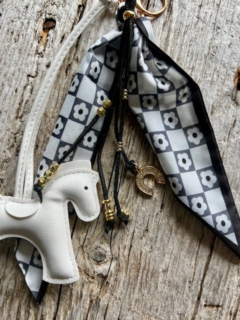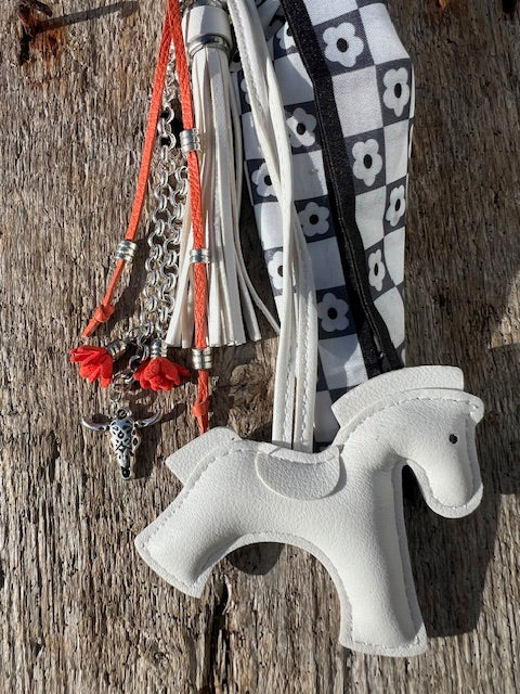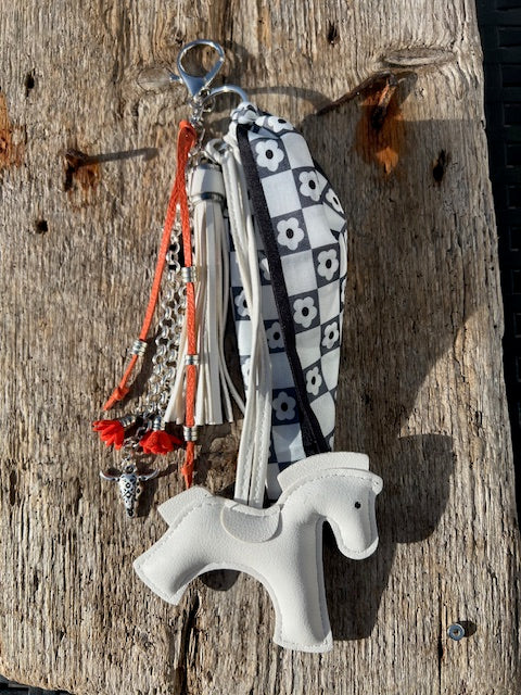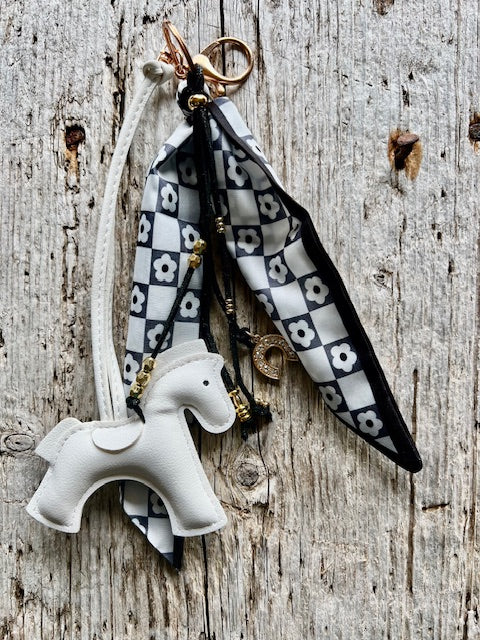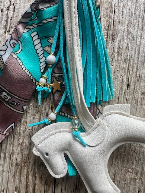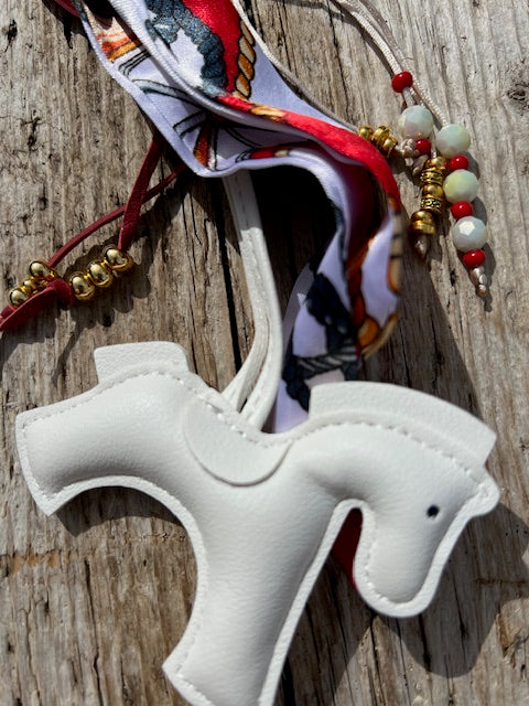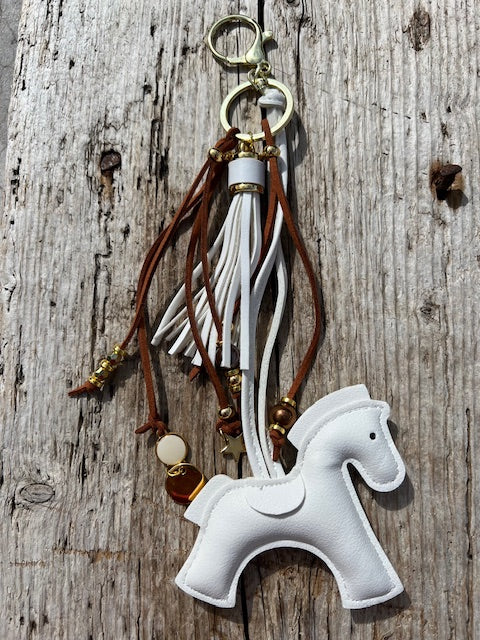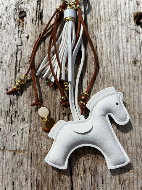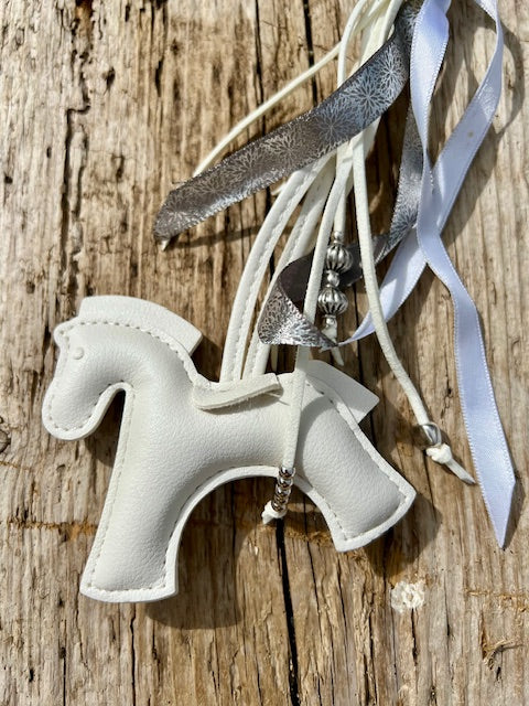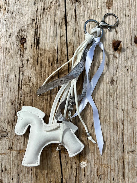 Joli porte-clés ou bijou de sac type charms réalisé avec un cheval en simili cuir, entièrement blanc.