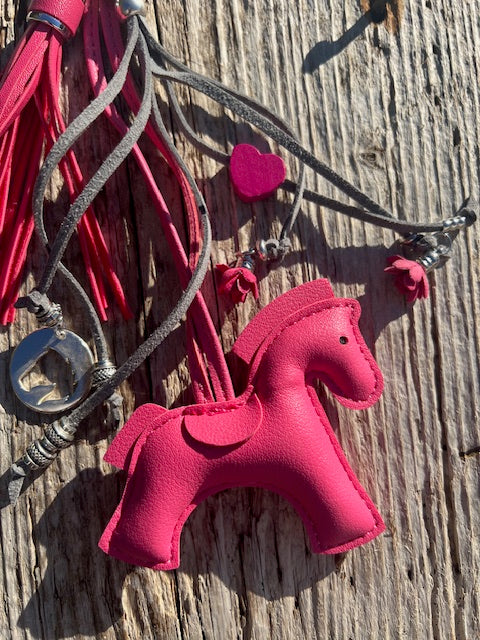 Joli porte-clés ou bijou de sac type charms réalisé avec un cheval en simili cuir, entièrement fuchsia.