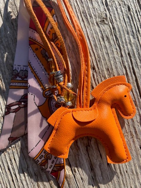 Joli porte-clés ou bijou de sac type charms réalisé avec un cheval en simili cuir, entièrement orange. Pompon en simili cuir.