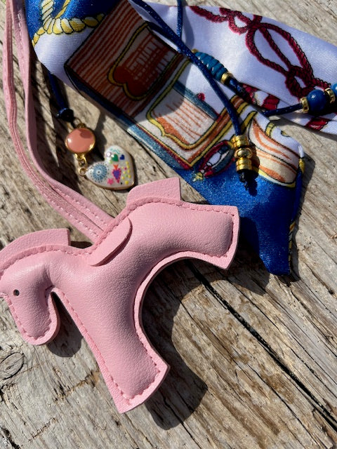 Joli porte-clés ou bijou de sac type charms réalisé avec un cheval en simili cuir, entièrement rose clair.
