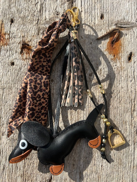 Joli porte-clés ou bijou de sac type charms réalisé avec un chien teckel en simili cuir, entièrement noir d'un côté et noir et beige de l'autre.