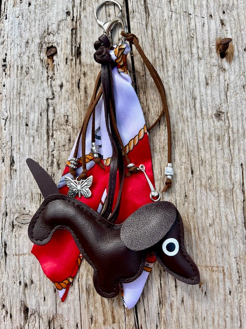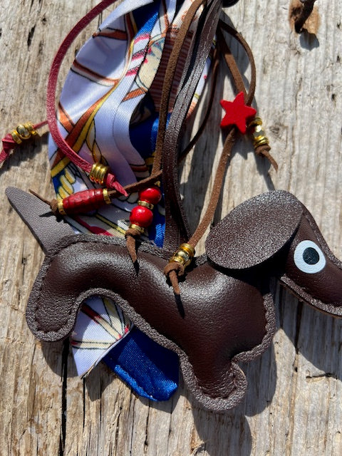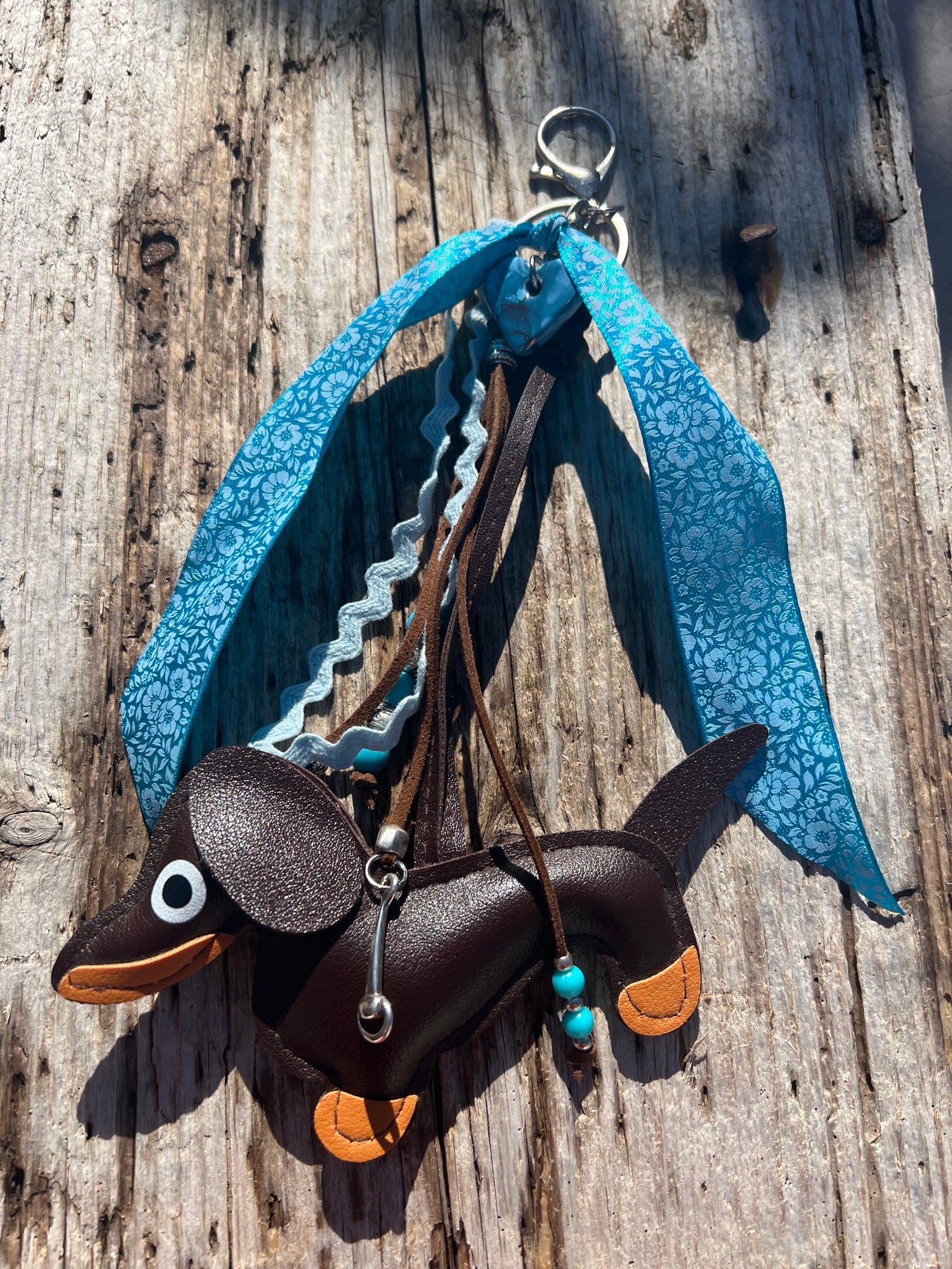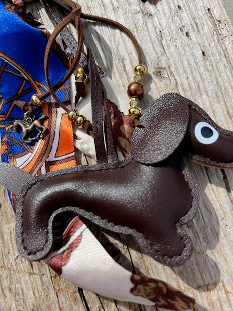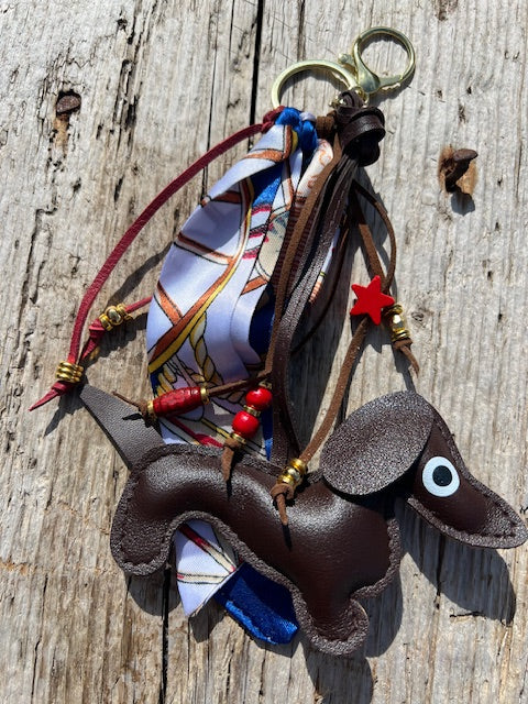Joli porte-clés ou bijou de sac type charms réalisé avec un chien teckel en simili cuir, entièrement marron d'un côté et marron et beige de l'autre.