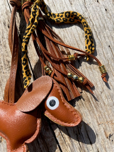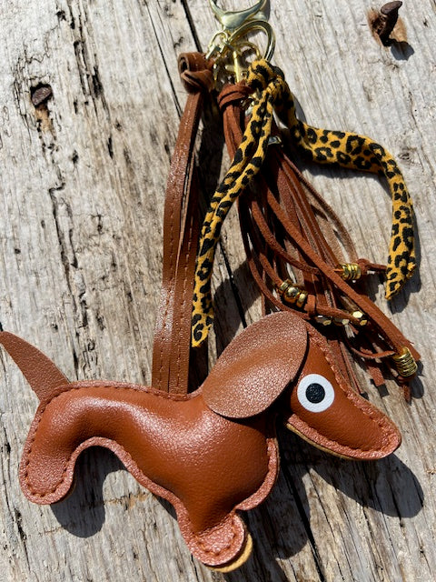 Joli porte-clés ou bijou de sac type charms réalisé avec un chien teckel en simili cuir, entièrement cognac (fauve) d'un côté et cognac et beige de l'autre.