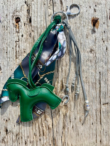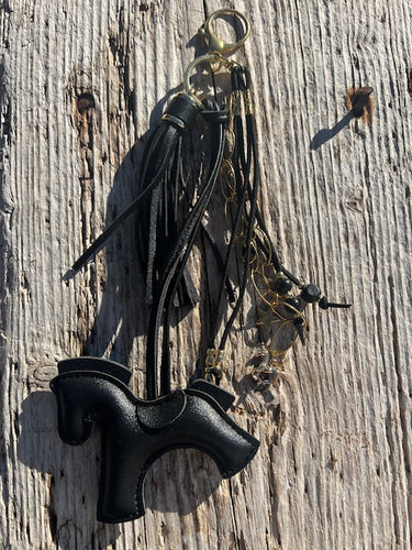 Porte clés ou bijou de sac, porte-bonheur ou Lucky Charms en acier inoxydable, pompon cuir, perles argent 10 microns, pendentifs étrier et mousquetons en argent 10 microns.